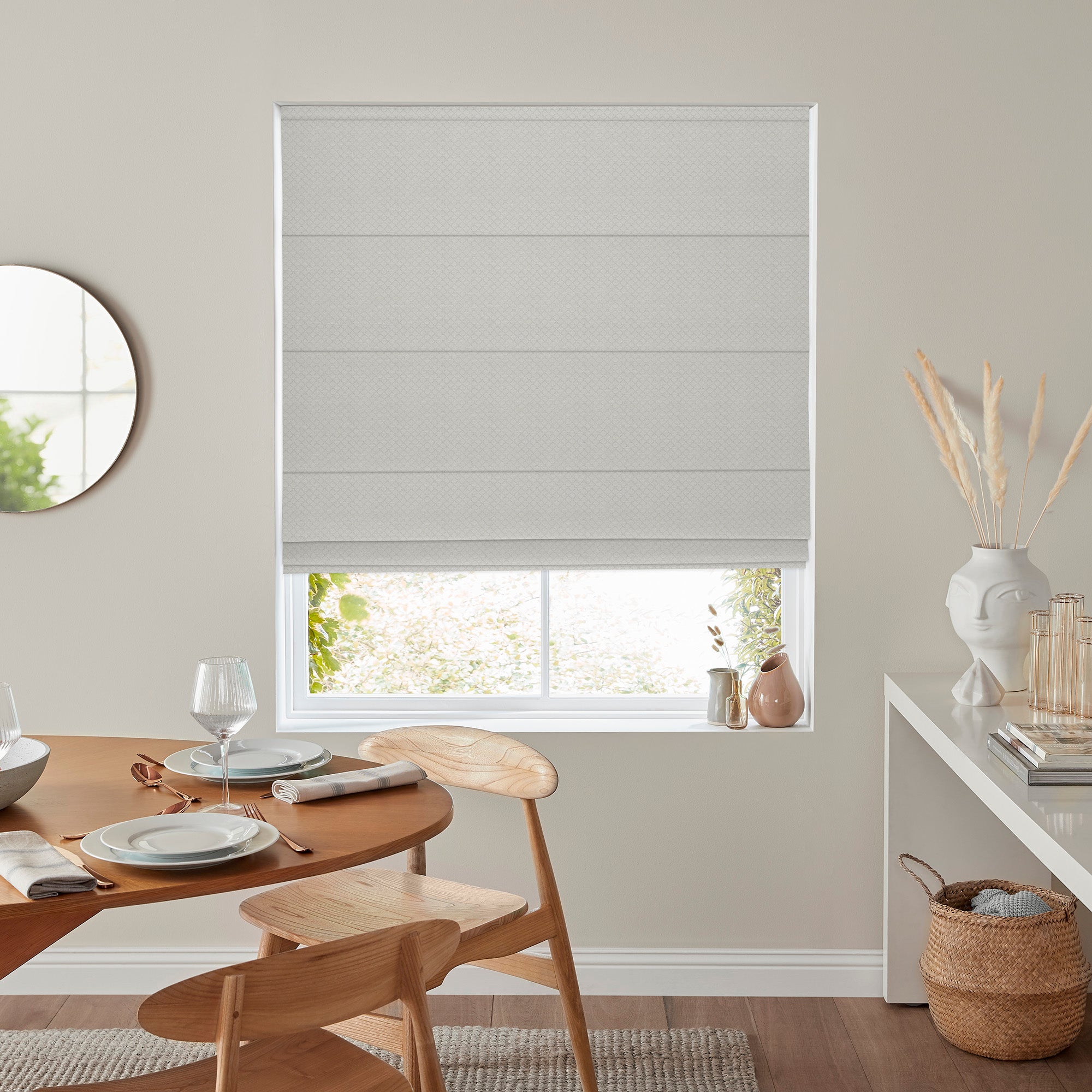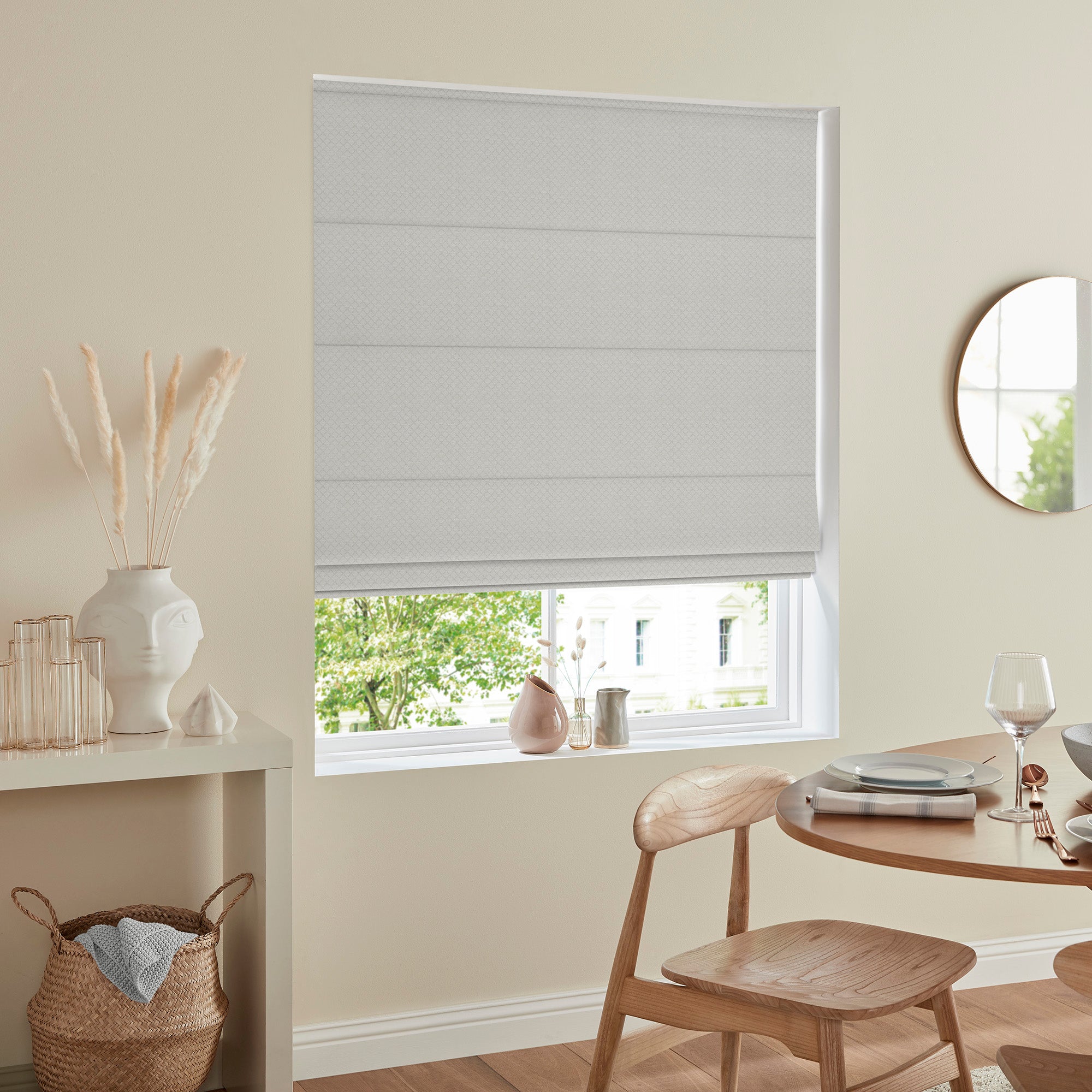 Elevate your windows with the Kristen Cloud Roman Blind, featuring a sophisticated silver and pale grey diamond pattern that brings contemporary geometric style to any room. This elegant blind combines timeless appeal with modern design, creating a focal point that complements both traditional and contemporary interiors. The crisp geometric detailing adds visual interest while maintaining a refined aesthetic. Perfect for living rooms, bedrooms, or studies, this Roman blind offers both beauty and practical light control. Transform your space with understated elegance that works beautifully with a variety of décor schemes.